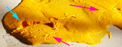 pâte est très friable (la flèche bleue pointe une entaille qui a arraché des